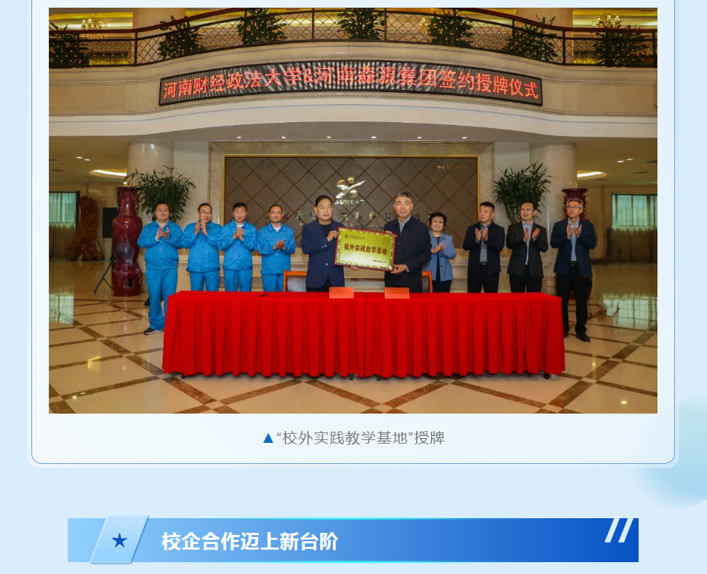 森源集团与河南财经政法大学将以此次战略合作协议签订、“校外实践教学基地”授牌为契机,推动双方校企合作迈上新的台阶。