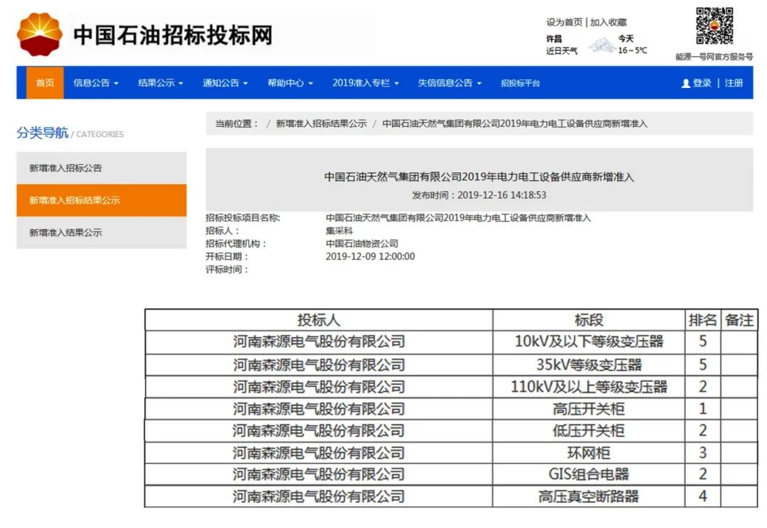 去年,森源电气在中国石油天然气集团有限公司2019年电力电工设备新增供应商准入项目招标中成功入围8类产品,包括10kV及以下等级变压器、35kV等级变压器、110kV及以上等级变压器、高压开关柜、低压开关柜、环网柜、GIS组合电器、高压真空断路器,目前已全部获得中石油集团公司一级供应商准入资格。