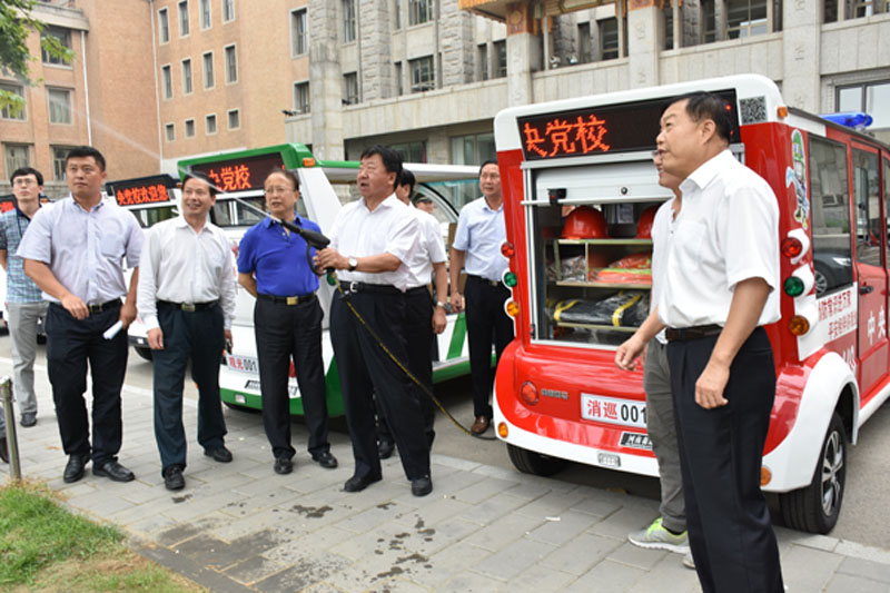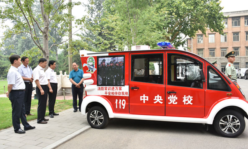 中共中央党校等领导观看了消防巡逻车演示并乘坐了电动巡逻车。期间,中共中央党校常务副校长何毅亭体验了使用消防车水枪,近距离的接触最直接的感受到了森源制造的魅力。
