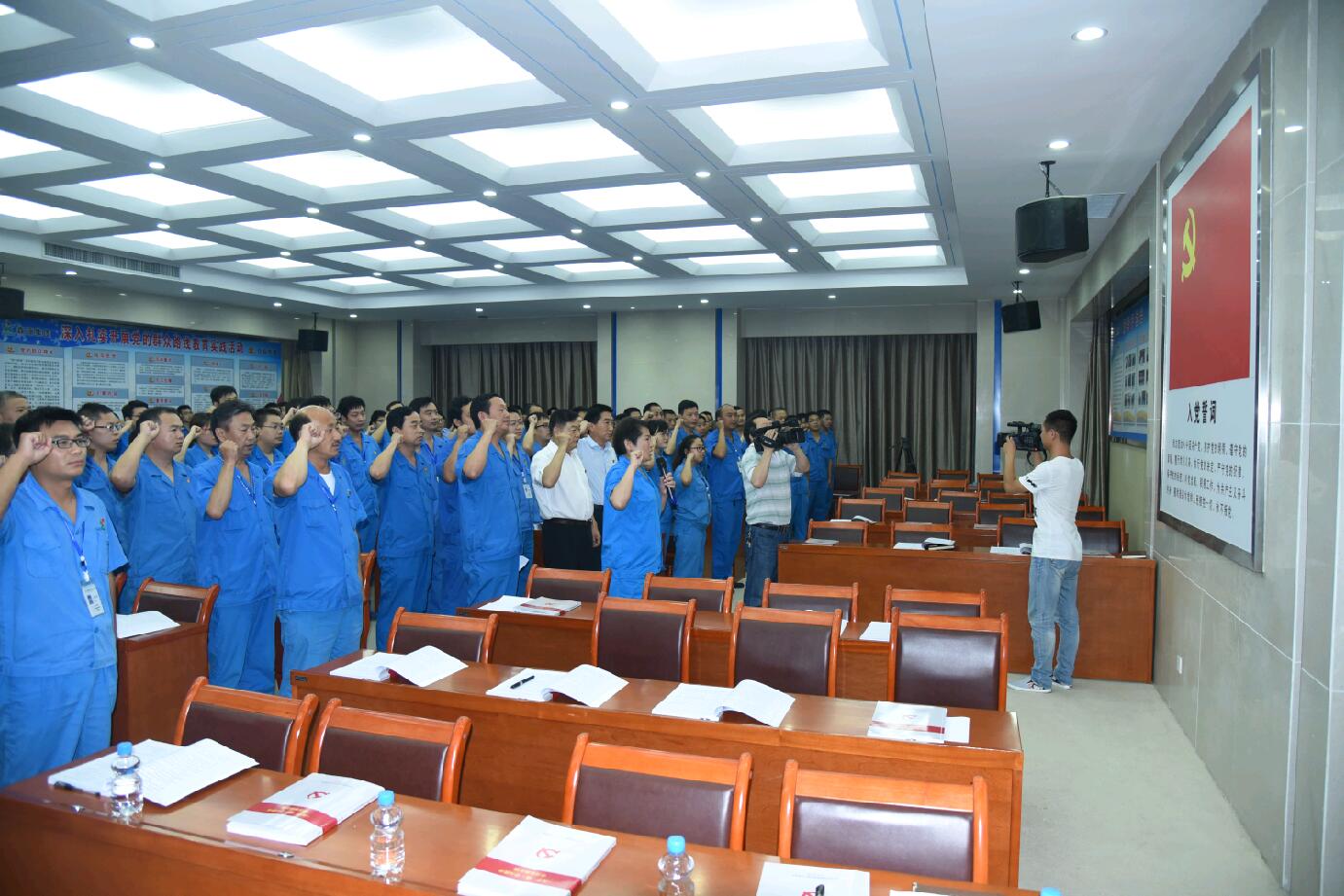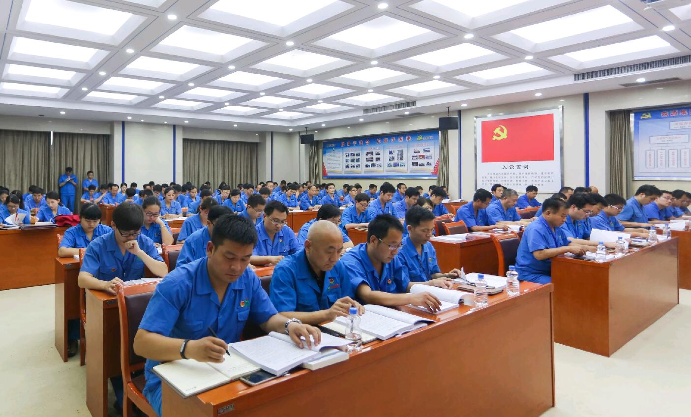 会议伊始,全体党员起立,面向党旗举起右手,重温入党誓词。每一位党员情绪饱满、神情专注,现场声音洪亮、气氛庄严。随后,集团党委副书记杨宏钊宣读了《关于开展“学党章党规、学系列讲话,做合格党员”学习教育的实施方案》,对“两学一做”学习教育工作进行动员部署。参会党员共同学习了党章,加深了对党的性质宗旨、目标任务、组织制度、作风纪律等的认识。当获奖的4个先进基层党支部代表及34名优秀共产党员上台领取奖牌、证书时,会场响起阵阵热烈的掌声。