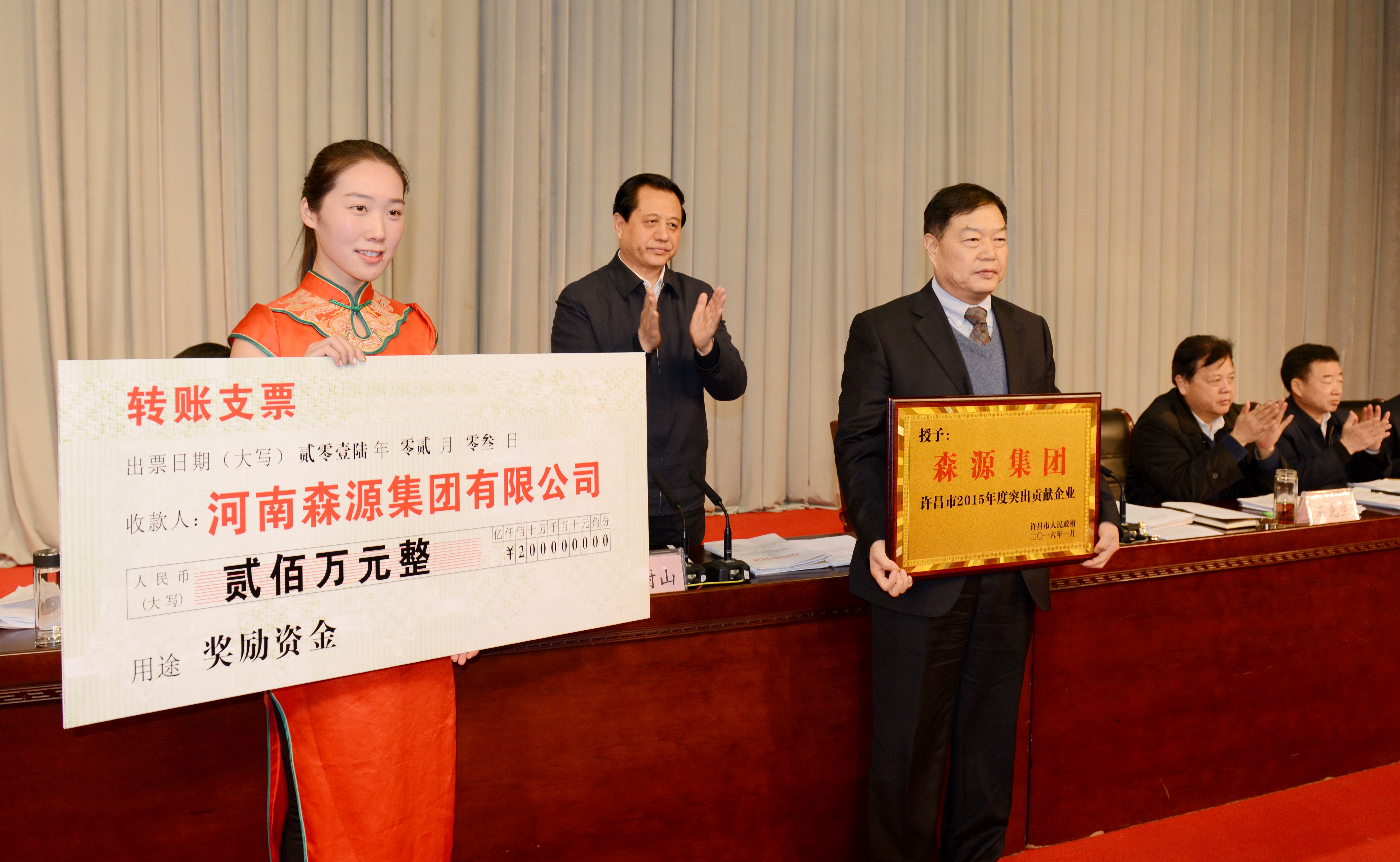 李建民宣读了许昌市人民政府《关于表彰奖励森源集团的决定》和《关于表彰2015年度杰出企业家优秀企业家成长型企业家的通报》。出席会议的市领导为获奖单位和企业家颁发证书和奖金。
